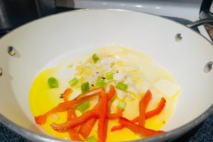 - In a large skillet, heat olive oil over medium heat; sauté the red pepper, onion and scallion with garlic, butter, and red pepper flakes.